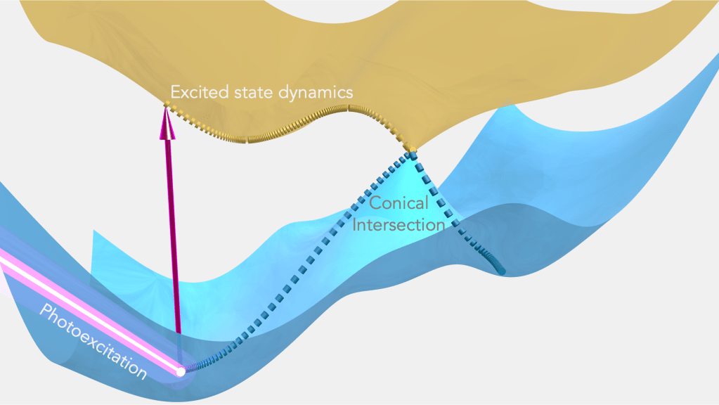Electronic excited states play a key role in the photophysics and photochemistry of chemical systems. The non-aufbau electronic configurations of electronic excited states make their simulation considerably more challenging than that of the ground state, which is a minimum of energy vs electronic degrees of freedom. This is especially the case for structures far away from the ground state equilibrium geometry (the “Franck-Condon region”), which are readily accessed by photoprocesses. For instance, population transfer between electronic states occurs most readily at geometries where the states are near degenerate in energy (“conical intersections”), leading to a breakdown of the Born-Oppenheimer approximation that decouples electronic and nuclear degrees of freedom. Accurate description of potential energy surfaces around these conical intersections is quite challenging for traditional electronic structure methods, with many popular approaches failing to even yield a qualitatively satisfactory description. We are working to develop new electronic structure methods that can accurately and efficiently simulate excited states, enabling the prediction of photophysical, photochemical, and spectroscopic properties.