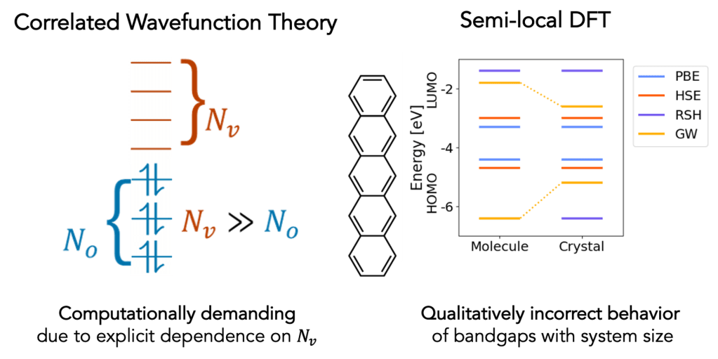 Density functional theory (DFT) is widely utilized to model the electronic structure of chemical systems, as it is computationally efficient compared to methods directly simulating the many-electron wavefunction. Most existing density functionals describe electron correlation using a local approach, i.e. utilizing information about the electron density at a single point in space independent of all other points. As a result, DFT is typically challenged in describing long-range correlations between electrons and related many-body effects, such as condensed phase screening of bandgaps. Correlated wavefunction methods like coupled cluster theory can describe nonlocal electron correlation, but only at prohibitive computational cost due to explicit dependence on unoccupied molecular orbitals. This makes use of such methods challenging for large condensed phase problems, precisely where the effects of long-range electron correlation matter the most. Our group develops efficient models for nonlocal correlation that seamlessly integrate with density functional theory, enabling more accurate simulations of condensed-phase systems.